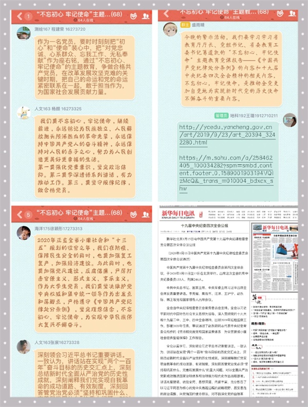 组织一次线上集中学习研讨。5月9-10日,组织师生党员就廉政教育工作主题开展线上集中学习研讨,师生党员认真学习十九届中央纪委四次全会精神,观看省教育厅厅长、党组书记、省委教育工委书记葛道凯的“不忘初心、牢记使命”主题教育党课报告——《中国共产党纪律处分条例》,进一步加强自身行为规范和自我约束能力。