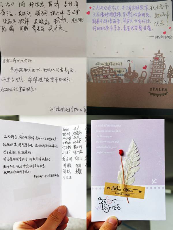 9月10日,在地科193班钟兰艳老师的《测量与地图学》课上,上课铃声刚刚响起,同学们迅速起立,齐声祝愿老师节日快乐。在地科191班,同学们在贺卡上亲笔画上了老师的漫画形象;在人文183班,每位同学在贺卡中亲笔写下了对老师浓浓的祝愿……城市学院通过组织青年员工自发制作祝福贺卡、手绘海报等方式,向教师节当天上课的全体教师送去节日祝福,引导员工感念师恩,珍惜大学美好时光。