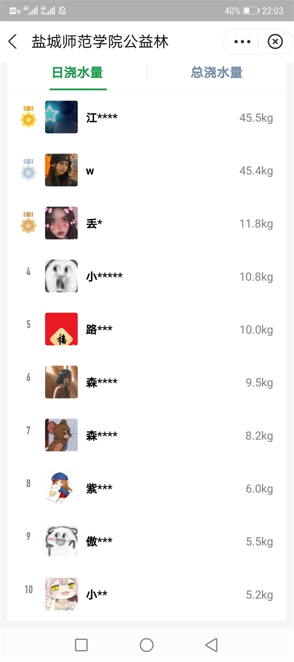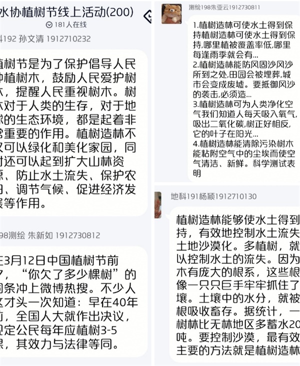 活动中,协会副会长徐芙蓉向参加活动的同学们科普植树节的由来与意义,同学们纷纷在QQ群中分享植树造林的看法以及保护自然资源的想法与见解。其中,地科202班张宇同学说:“年年植树树成荫,代代造林林成森。植树造林应该落到每个人身上,这是责任,更是义务。”随后,同学们通过绿色出行、爱心捐赠、在线支付等形式积攒的能量在支付宝“蚂蚁森林”为盐师公益林浇水。据统计,线上共有180名同学收集到222.7千克水滴,其中地科191班赵澎同学捐出45.5千克水滴。