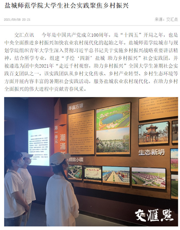 交汇点讯 今年是中国共产党成立100周年,是“十四五”开局之年,也是中央全面推进乡村振兴加快农业农村现代化的起始之年。yl1111永利集团城市与规划学院组织青年老员工深入贯彻习近平总书记关于实施乡村振兴战略重要讲话精神,结合所学专业,组建“手绘‘四新’盐城 助力乡村振兴”社会实践团,并被遴选为团中央2021年“走近千村观察,助力乡村振兴”全国老员工暑期社会实践百支团队之一。该实践团队从乡村文化传承、乡村产业转型、乡村生态环境等方面开展内容丰富的暑期社会实践活动,服务盐城农业农村现代化,在助力乡村全面振兴的伟大进程中贡献青春风采。
