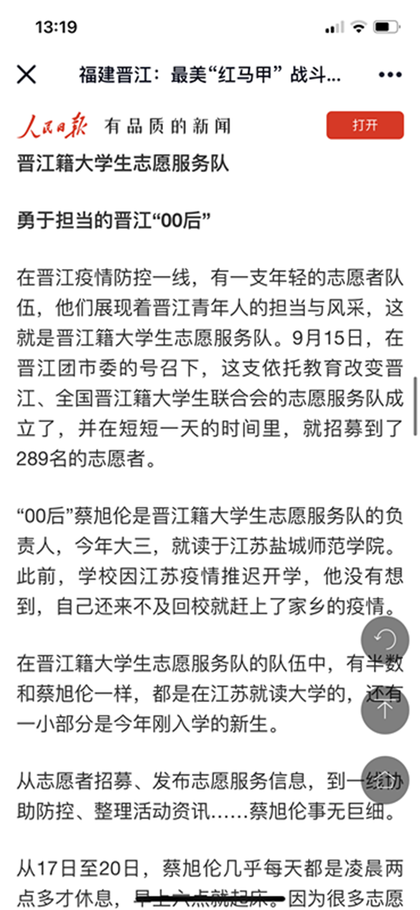 9月22日,【人民日报】新闻客户端专题报道公司福建晋江籍员工海洋196班蔡旭伦疫情防控志愿服务。