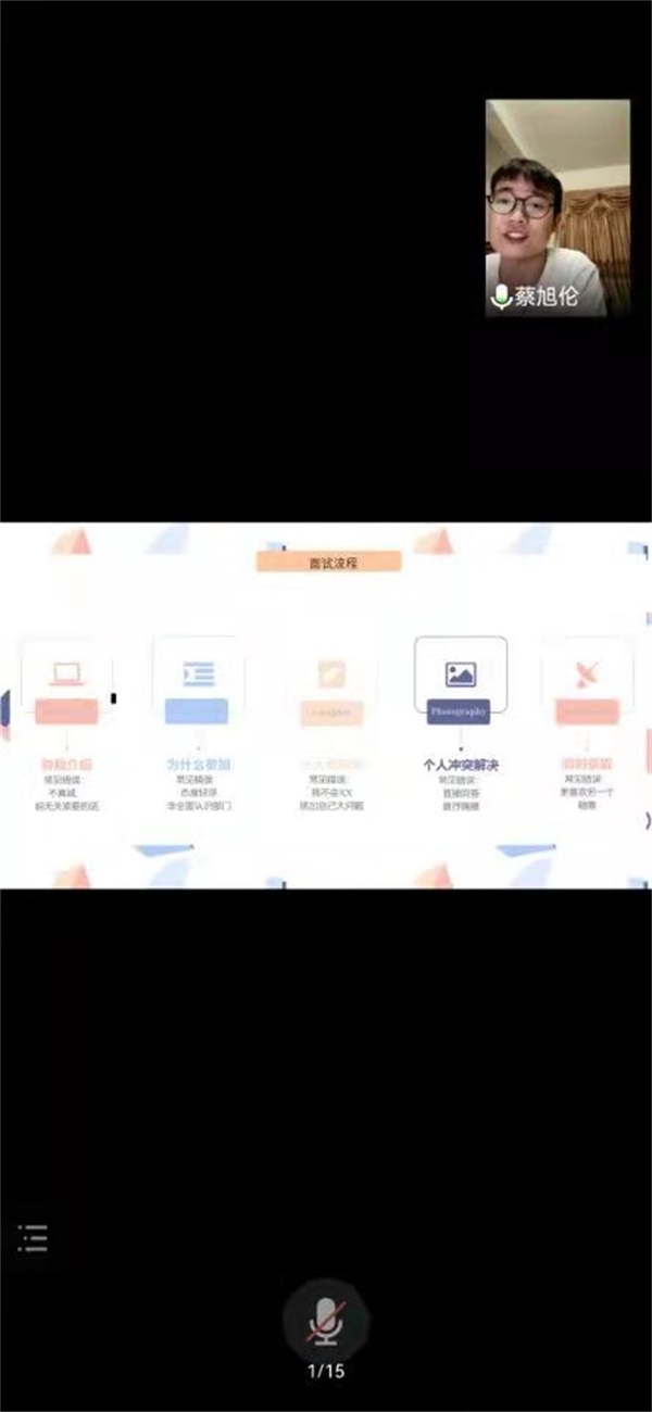 会议开始,生涯规划部工作人员、海洋207班苏畅同学简单介绍了公司员工组织情况及本次活动主要目的。随后,海洋196班蔡旭伦同学从面试的流程角度入手,详细地解释了面试中自我介绍时的注意点:要真诚,不说无关紧要的话;同时又让同学们进行反思,明确自己面试的目的,多问问自己为什么要参加这个组织和社团;接着,他向同学们提出面试的大忌,要正确的认识到自己的优缺点;最后是最为精彩的线上模拟面试环节,来自地科213班的尤晓波同学首当其冲,模拟面试结果非常的出色,同时部分其他参会的同学也给尤同学提出了一些个人建议,给同学们留下了深刻的印象。
