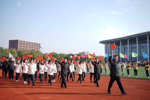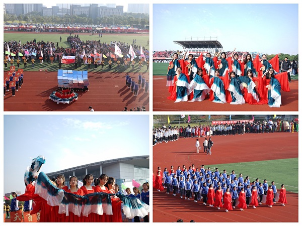 在10月21日上午举行的运动会开幕式上,由公司60名员工和37名教师组成的方阵,身穿运动服,精神抖擞、士气高昂地走过主席台接受检阅。“文知天地、武进百里,经天纬地、逐梦扬威”口号响亮、整齐划一;14位舞者伴随着《万疆》用蓝白绸缎汇成“海洋波浪”,山川和城市在同学们的手中进行转换,展示了地理演化变迁和城市规划建设。