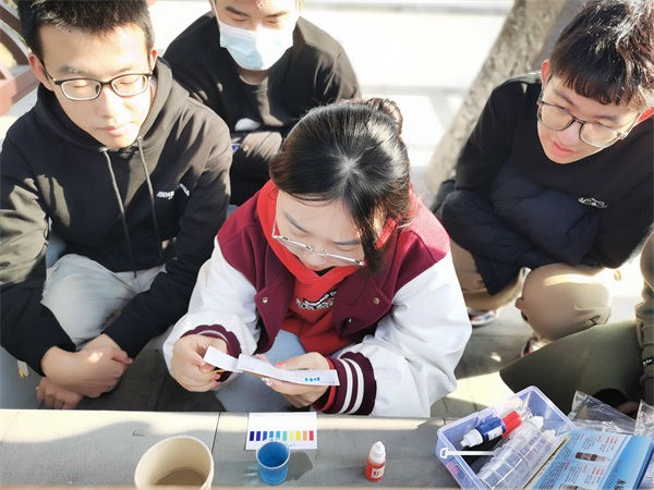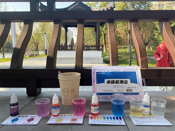 本次水质检测活动采用理论与实践相结合的方式。参加活动的十一名同学查询水质检测标准并携带pH试纸、检测试剂等用具,现场采集串场河水样,在水样中加入检测试剂,与色别表比较,以此获得河水的相关信息。经检测,串场河水为活性水,水质偏碱性,含锌以及少量余氯。活动结束后,十一名同学一起清理场地,总结并分享此次活动的感想。