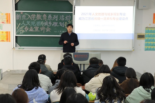 在讲座中,李传武与同学们分享了人文地理与城乡规划专业获批江苏省省级一流本科专业建设点的喜讯。李传武围绕专业历史沿革、专业比较优势、专业亮点特色三个方面进行了详细的介绍,他详细的介绍了近二十年来专业发展取得的一系列成就,并指出取得这些成绩与每一位老师和每一位员工的努力分不开的;他指出人文专业发展定位是立足长三角、聚焦乡村问题、培养乡村规划师,并介绍了目前学院加强社会资源整合,积极投入到当地的乡村振兴服务中;他指出学院拥有众多高水平研究平台,培养了一批又一批的高质量的人才。