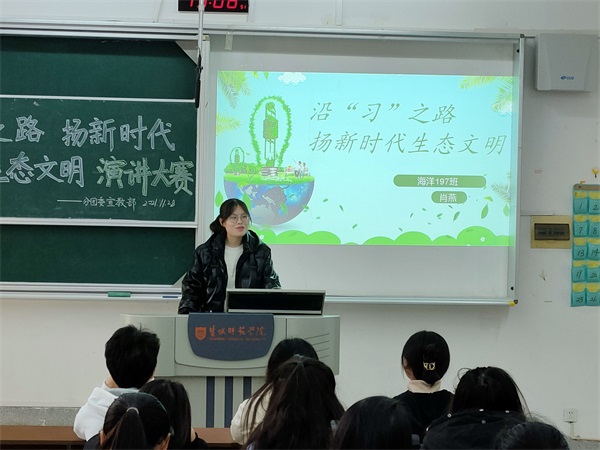 在活动中,同学们共同观看了“共建地球生命共同体”的宣传视频,在对新时代生态文明建设进行了深入学习后,演讲比赛按照既定的顺序进行。海洋196班肖燕同学以“日本核污染”这一国际问题切入,强调新时代生态文明的建设需要全世界人民共同合作;地科211班兰永柳从“白色污染”角度出发,提出新时代生态文明建设是现实之需,更是发展之要;地科203班王熹更是从老员工日常生活中寻求参与生态文明建设的方法,呼吁大家立足自身,以实际行动响应时代号召。活动中同学们积极思考,细致表达,现场气氛十分活跃,展现出当代老员工的责任与担当。