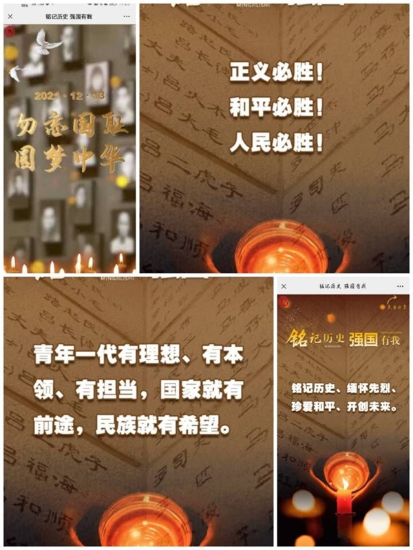 12月13日是南京大屠杀死难者国家公祭日。为深入开展爱国主义教育,弘扬民族精神,倡导和平、友好、合作理念,牢记历史、不忘过去,珍爱和平、开创未来,12月9日至15日,我院在国家公祭日前后开展“铭记历史 强国有我”国家公祭日老员工“网上答题烛光祭”活动。