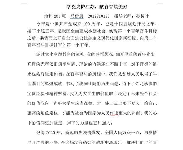 通过层层筛选,公司李欣彤同学荣获二等奖,地科201班的马伊晨同学获得优秀奖。李欣彤同学的文章运用了多个精炼的小标题,准确地展现了“返家乡”社会实践活动的几个方面,行文条理清楚,内容详实,在阅读过程中更快更准确地理解文章内容并了解写作意图,给人留下了深刻的印象。马伊晨同学巧妙地将身边人及自身的经历融入文章,真实感人,表达出党史学习的感悟以及对未来的展望。
