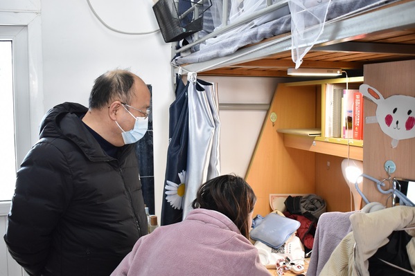 走访期间,郝保成与同学们展开亲切交谈,仔细询问了同学们线上上课的情况,听取了同学们对线上上课的感受,对同学们遇到的困难和疑惑进行了解答,详细了解了员工上网课的状态、网络流畅性、教师上课质量、网课学习成效等问题。郝保成跟同学们强调不能因为线上教学而放松对个人的学习要求,要妥善安排好时间,养成良好的生活作息习惯,调整学习状态。他还嘱咐同学们要主动适应线上上课的学习模式,加强专业知识的学习和专业素质的培养,同时课余期间要多走出宿舍,积极参加体育活动,锻炼身体,增强体质和免疫力。同学们纷纷表示将严格遵守学校的疫情防控规定,认真学习,不辜负老师的厚望。