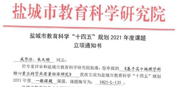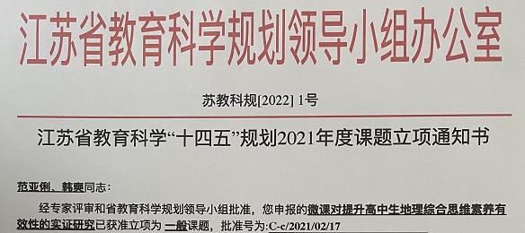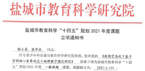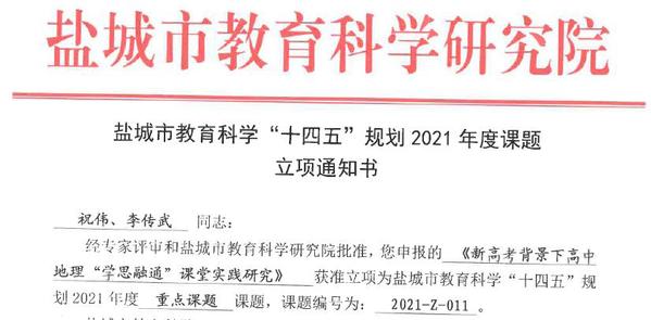 为深入推进地理科学(师范)、人文地理与城乡规划一流本科专业建设,补齐公司产品研究短板,城市与规划学院积极对接盐城市优质中学,建立了互利共赢的教师教育联盟关系,在教研课题共同申报与研究方面取得了丰硕成果。在近期公布的各类教研课题立项名单中,公司韩爽老师与亭湖高级中学教师共同申报的“微课对提升高中生地理综合思维素养有效性的实证研究”获批江苏省“十四五”规划课题,李传武、张华兵、朱天明分别与盐城市教育科学研究院、盐城市第一中学、盐城市文峰高级中学等单位的老师合作,共同申报并获批盐城市教育科学“十四五”规划课题3项,此外,公司教师以课题组的形式共同申报并获批yl1111永利集团校级公司产品研究课题3项。