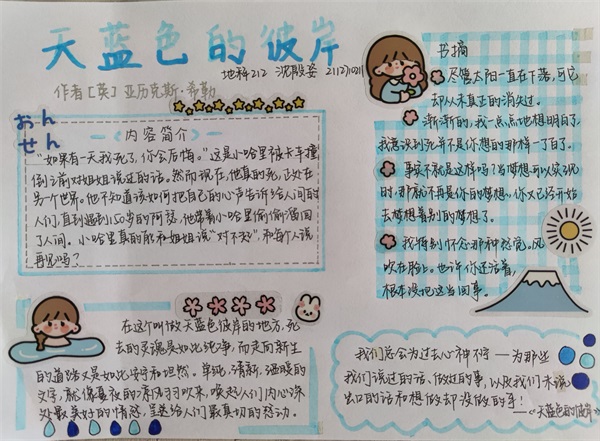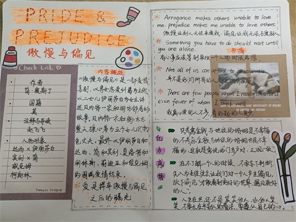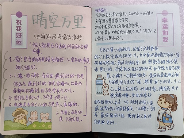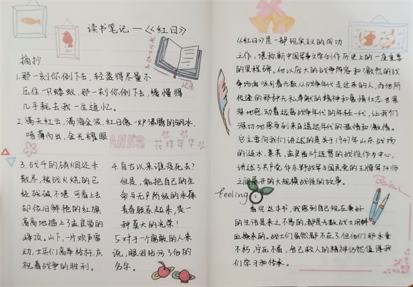 本次活动吸引了大批同学们的积极参与,同学们提交的读书笔记内容丰富,字迹工整,每一页笔记都显露出同学们独到的读书心得。其中,地科211班戴朱慧同学关于《追风筝的人》的读书笔记令人印象深刻,她整理出了她书目中复杂的人物关系并做了一系列经典语句的摘抄,呼吁同学们无论心中的风筝是什么,都要勇敢地追。地科211班黄璐瑶同学完成了一篇关于名著《傲慢与偏见》的读书笔记,她在简洁的内容概述后着重分享了自己阅读的心得体会,她告诉同学们不要太在乎别人的看法,而要遵从自己的心。地科212班杨嘉悦同学在《呐喊》一书的读书笔记中对鲁迅先生笔下的中国人做了归纳,作为新时代的员工,我们更要加以自省,只争朝夕,不负韶华。