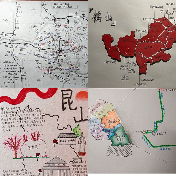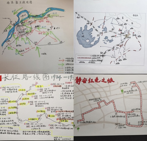 绘制红色历史路线。参与本活动的员工通过查阅资料、了解相关史实,结合专业特色,用纸笔绘制出红色历史事件的路线图。其中,地科203班张芯源同学创作的1937年12月至次年6月间的徐州会战要图,详细记录了那一段烽火岁月里中国军民抗击侵略者的过程。地科212班贾彦冰同学用画笔画下了1934至1936年的长征路线图,生动展示了可歌可泣的长征史诗和伟大的长征精神。