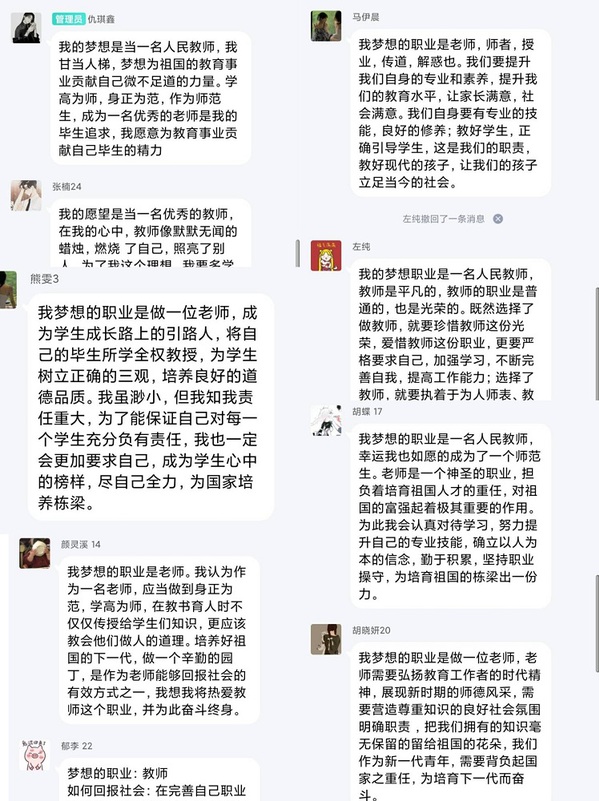 在班会上,何曜黄建议同学们虽然因疫情而进行线上上课,但是要严格要求自己,充分利用课余时间提升自己,他从精神信仰、工作态度、生命尺度等方面详细介绍了王强精神的内涵。在班会上,优秀员工代表进行学习经验分享。颜灵溪同学认为:“坚定理想、勇于创新、奋斗不止是青年老员工应当秉持的行为准则。要将王强教授作为学习的榜样,牢记使命,扎根乡村,奉献青春,用实际行动诠释社会主义核心价值观的深刻内涵。”活动最后,全班同学就自己的梦想和以后如何实行王强精神提出了自己的想法。