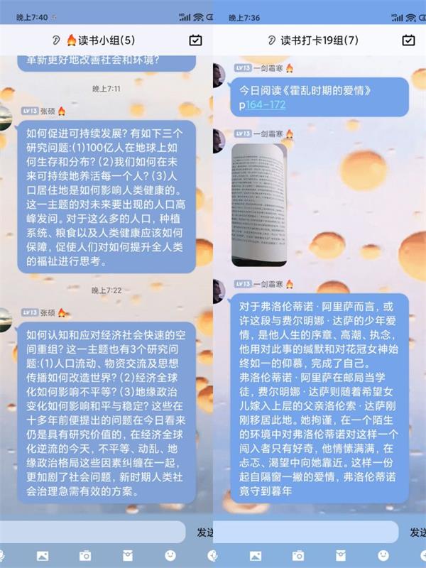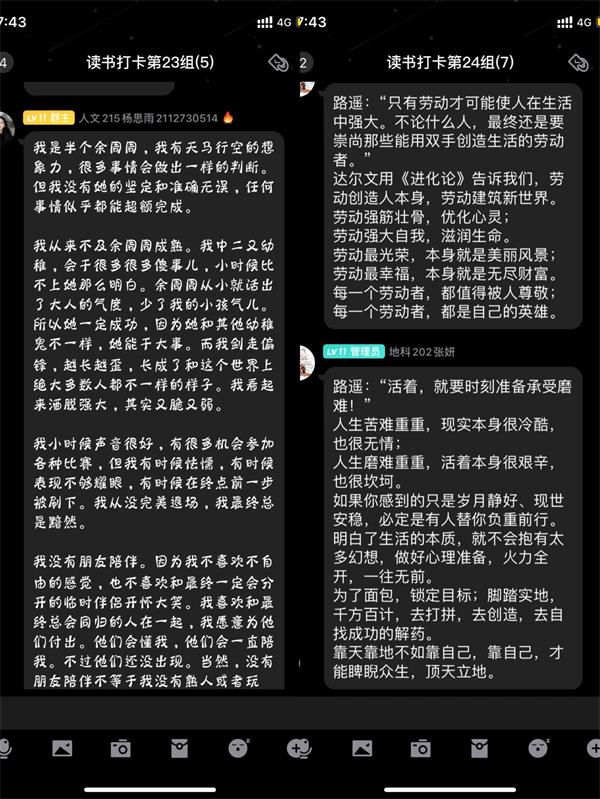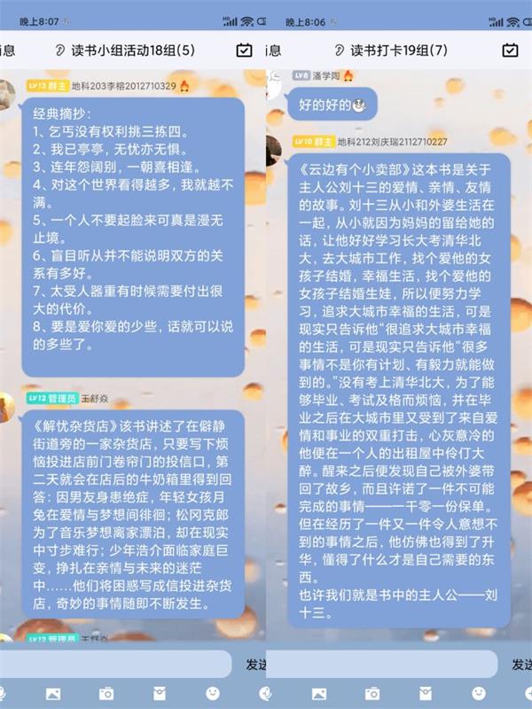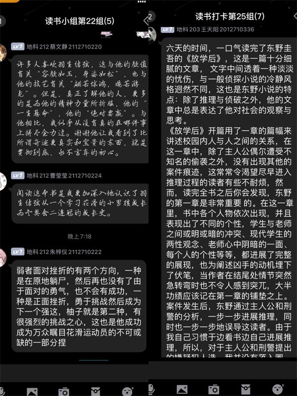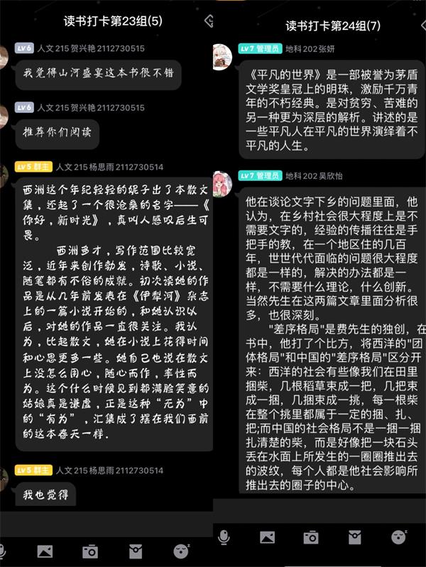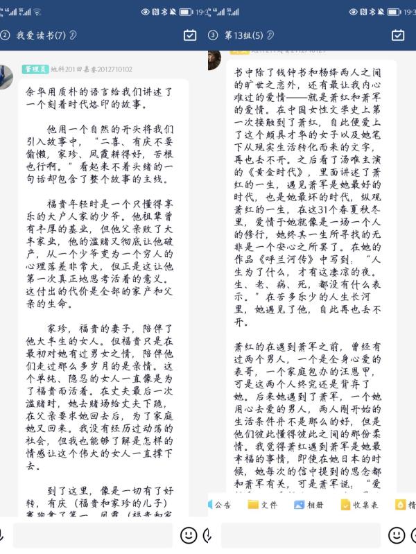本次的活动吸引了大批同学的积极参与,很多同学平日里都喜爱阅读,并借此次活动机会与更多的同学分享自己的读书心得。其中,人文215班的杨思雨同学向其小组成员们介绍并推荐了她所喜欢的作家西洲,通过阅读西洲的作品,她可以感受到属于春天的随心与率性,在最美的人间四月天里有趣有盼,热爱生活。地科202班的吴欣怡同学向成员们分享了费孝通先生的《乡土中国》,在她介绍完书中费先生讨论的问题后,我们可以深刻的感受到乡村社会中的文化深厚,感悟民族从土里长出的光荣历史。地科212班的蔡文静,曹莹莹以及朱梓仪三位同学就羽生结弦这名花滑运动员的经历进行了讨论分享,在他身上那一种为梦想不断拼搏努力,直面困难永不言弃的精神值得我们所有人去学习。