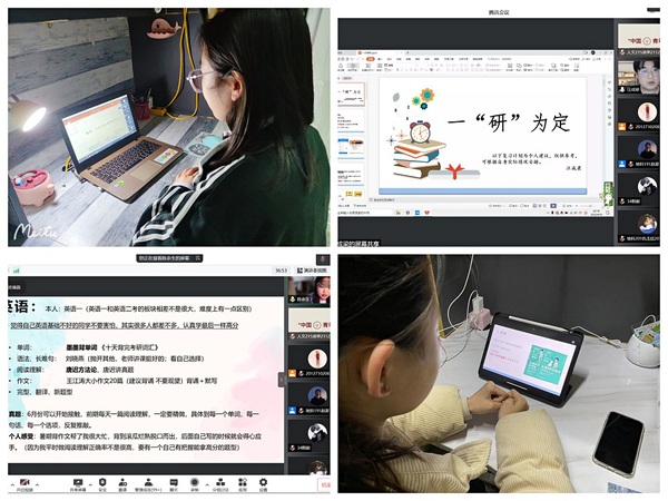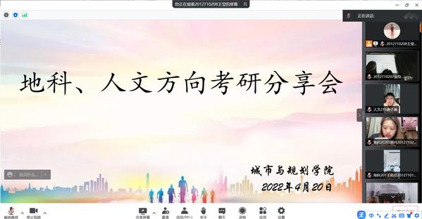 在本次分享会中,陈余生分享了择校以及选专业的建议,讲解了每门科目的备考经验;李铭提出考研是一场持久战,需要对自己有客观认识,但不能否定自己,选择和努力一样重要的观点;顾洋分析了考研面临的问题,对前面两位分享者进行了补充,强调良好心态和劳逸结合的重要性;汪成梁强调了考研要有计划,可以和研友相互监督与帮助;张红苗分享了自己的考研经历,提出了疫情下学习的方法,按部就班就是伟大,同学们应以笔为枪,以梦为马。在线上提问交流环节,陈余生针对学弟学妹们关于考研数学学习时间和技巧的问题作出了回答:数学的准备必须尽早开始,多做题,不到最后一刻决不放弃;李铭解决了同学们关于地理就业方向的问题;顾洋回答了同学们对考研选择的问题,不能好高骛远也不能妄自菲薄。提问环节同学们热情高涨,积极参与,分享者们也耐心地回答,气氛良好。