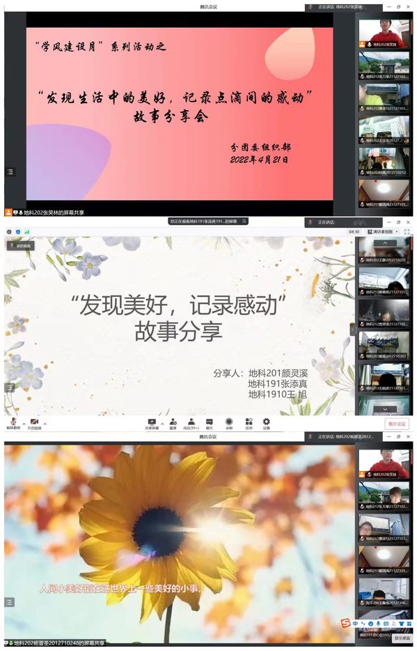 分享生活美好。4月21日晚,公司通过网络平台开展了美好故事分享会。其中,地科201班颜灵溪同学通过图文并茂的PPT向大家讲述了她和地科191班张添真、地科1910班王旭同学之间的故事:她们积极参与志愿服务,助力校园疫情防控工作。此外,她们在日常生活中形成的深厚友情让参与本次活动的同学们感动。
