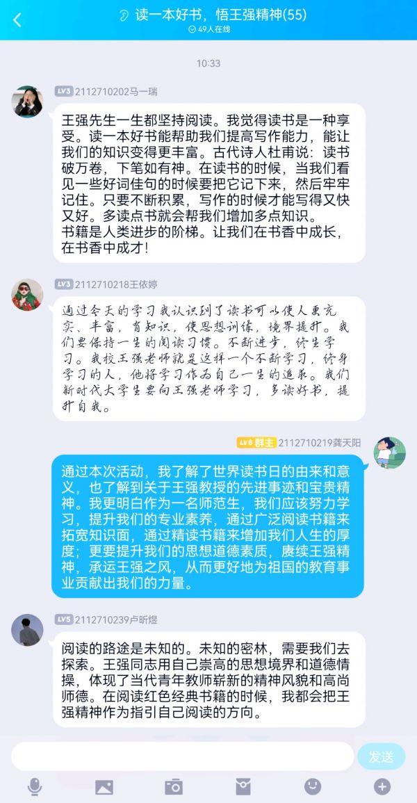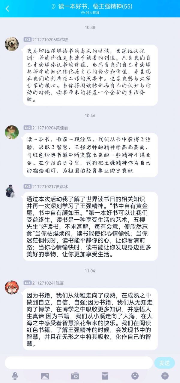 在本次活动中,主持人卢昕煜同学先为大家介绍了王强同志和王强精神的丰富内涵,接着科普了世界读书日的由来。介绍完毕,闵竹韵、王喻申、李丹妮等同学积极主动地分享了自己在读的、充分体现王强精神的书籍。读一本好书,如同在和精神高尚的人对话,这些书无一不让同学们感到站在对面的就是王强同志。紧接着,主持人向大家展示了最近的读书笔记与阅读手抄报,智慧的文字与简单的花纹承载的是员工们坚韧和有趣的灵魂。活动的最后,许多同学有感而发,积极参与线上讨论,分享自己的感悟。