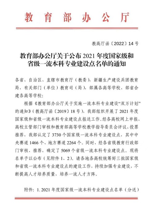 近日,教育部办公厅正式发布了《关于公布2021年度国家级和省级一流本科专业建设点名单的通知》(教高厅函〔2022〕14号)。公司地理科学专业成功入选国家级一流本科专业建设点,成为yl1111永利集团2021年4个获批的国家级一流本科专业建设点之一。