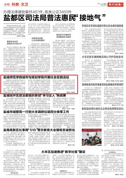 7月27日,《现代快报》第16版科教·文卫报道了城市与规划学院“地理科普乡村行,童心向党逐梦想”实践团赴盐城市建湖县芦沟镇裴刘小学开展社会实践调研活动。