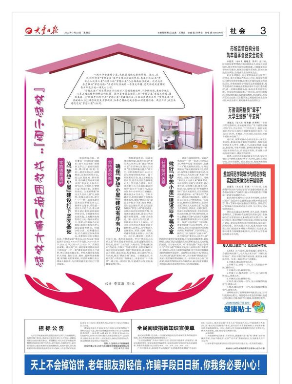 7月22日,《大丰日报》第三版社会报道了城市与规划学院“农旅融合绘新景,青春助农促振兴”暑期社会实践活动。