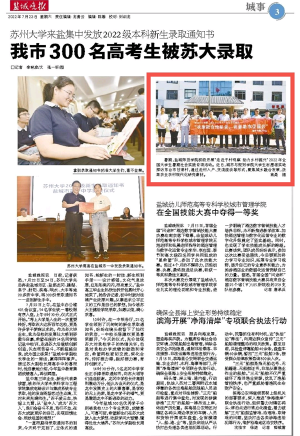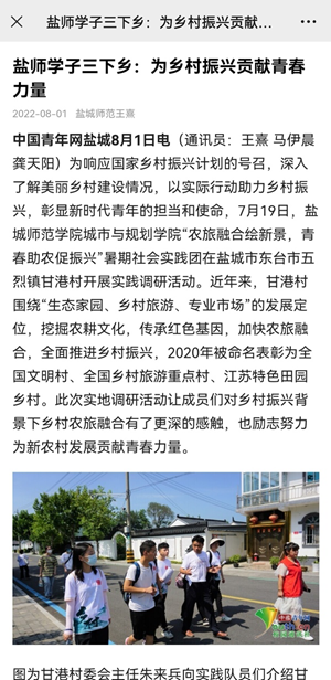 7月23日,《盐城晚报》A03版以图片新闻的形式报道了城市与规划学院“农旅融合绘新景,青春助农促振兴”暑期实践活动。