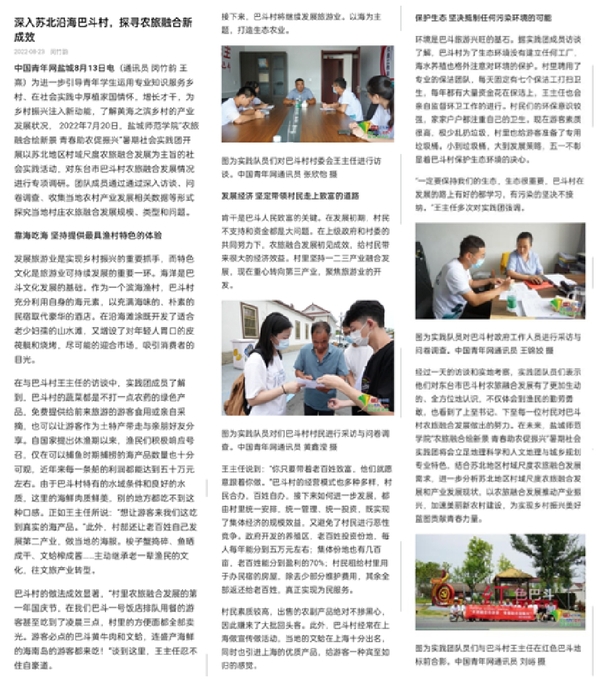 原文如下:为进一步引导青年员工运用专业知识服务乡村、在社会实践中厚植家国情怀,增长才干,为乡村振兴注入新动能,了解黄海之滨乡村的产业发展状况, 2022年7月20日,yl1111永利集团“农旅融合绘新景 青春助农促振兴”暑期社会实践团开展以苏北地区村域尺度农旅融合发展为主旨的社会实践活动,对东台市巴斗村农旅融合发展情况进行专项调研。团队成员通过通过深入访谈、问卷调查、收集当地农村产业发展相关数据等形式探究当地村庄农旅融合发展规模、类型和问题。