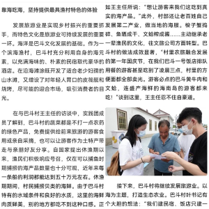 在与巴斗村王主任的访谈中,实践团成员了解到,巴斗村的蔬菜都是不打一点农药的绿色产品,免费提供给前来旅游的游客食用或亲自采摘,也可以让游客作为土特产带走与亲朋好友分享。自国家提出休渔期以来,渔民们积极响应号召,仅在可以捕鱼时期捕捞的海产品数量也十分可观,近年来每一条船的利润都能达到五十万元左右。休渔期期间,村民捕捞贝类的海鲜。由于巴斗村特有的水域条件和良好的水质,这里的海鲜肉质鲜美,别的地方都吃不到这种口感。正如王主任所说:“想让游客来我们这吃到真实的海产品。”此外,村部还让老百姓自己发展第二产业,做当地的海服。梭子蟹捣碎、鱼晒成干、文蛤榨成酱……主动继承老一辈渔民的文化,往文旅公司方面转型。巴斗村的做法成效显著,“村里农旅融合发展的第一年国庆节,在我们巴斗一号饭店排队用餐的游客甚至吃到了凌晨三点,村里的方便面都全部卖光。游客必点的巴斗黄牛肉和文蛤,连盛产海鲜的海南岛的游客都来吃!”谈到这里,王主任忍不住自豪道。