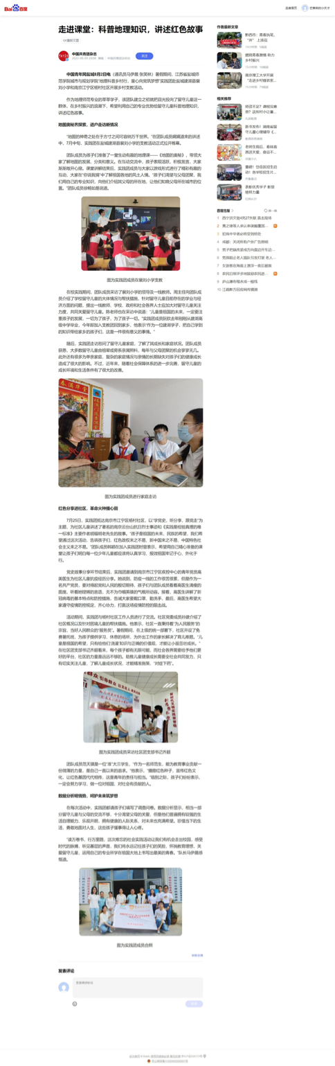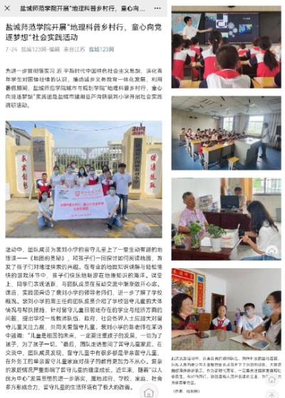 原文如下:暑假期间,江苏省yl1111永利集团城市与规划学院“地理科普乡村行,童心向党筑梦想”实践团赴盐城建湖县裴刘小学和南京江宁区杨村社区开展乡村支教活动。