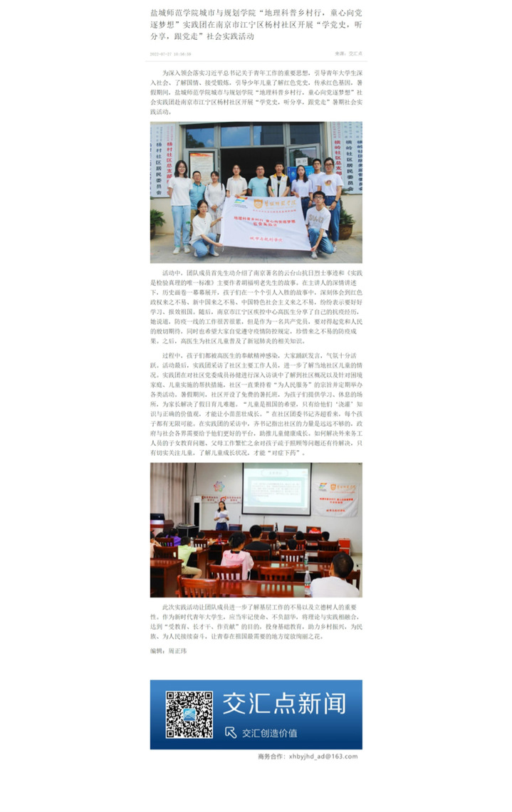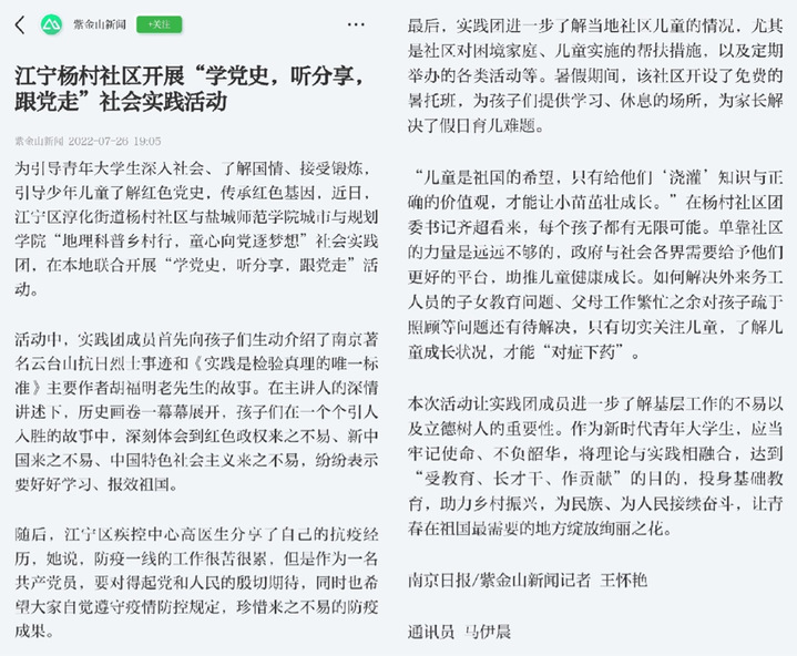 7月26日与7月27日,《紫金山新闻》、《交汇点新闻》报道了城市与规划学院“农旅融合绘新景,青春助农促振兴”实践团的暑期社会实践活动。