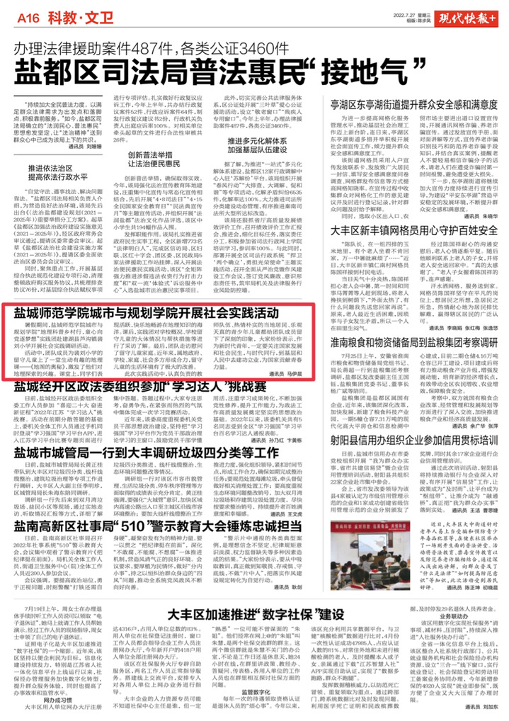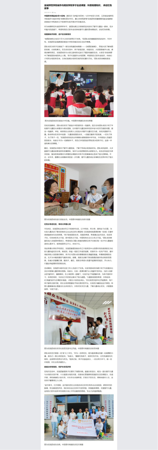 7月24日,《盐城123网》报道了城市与规划学院“农旅融合绘新景,青春助农促振兴”实践团的暑期社会实践活动。