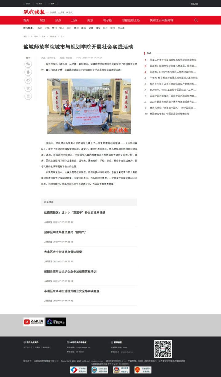 7月27日,《现代快报》与《现代快报网》报道了城市与规划学院“农旅融合绘新景,青春助农促振兴”实践团的暑期社会实践活动。