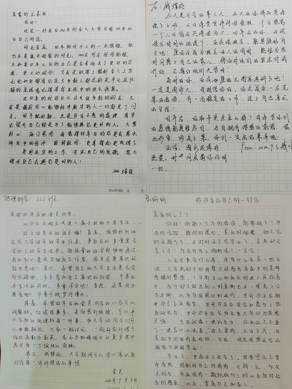 在同学们完成自我介绍后,主题活动进入了“想对四年后的自己说”部分。在这一环节中,同学们用笔给四年后的自己写下了一封封信,大家将自己对未来的期许、对生活的向往化成一段段文字,留在纸上,记在心间。大家纷纷表示,一定奋发有为,不负青春,在青春的赛道上奋力奔跑,让青春在拼搏中绽放光彩。