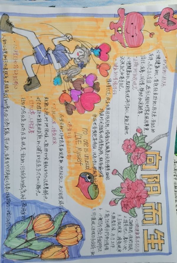 本次比赛吸引了大批新生积极参与,同学们提交的手抄报制作精美,内容丰富且含有深意,每一处的字迹都整整齐齐。其中,人文224班的许子慧同学巧妙运用丰富的色彩和开朗的文笔,呼吁大家忘记烦恼忧愁,在生活中相信自己,万事冷静,永远心向阳光,拒绝抑郁。地科222班的游芷颖同学所制作的手抄报,借用著名心理学家的名言为我们介绍了心理健康,心理健康应是一种良好而持续的心理状态,尊重自我,尊重他人,适应当前的生活环境,充分实现自我。地科223班仲宁同学的手抄报作品绘画技艺精湛,指出了当代老员工的主要压力,正视自己,合理的制定目标,注意调整自己的心态,我们便可心若向阳,无畏忧伤。
