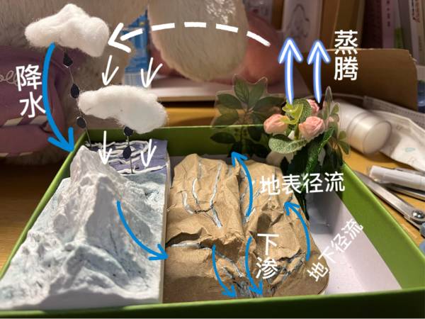 活动前期,协会积极准备并做好宣传工作。活动过程中,同学们根据自身对水循环过程的理解,运用彩笔、ps软件等工具制作出了许多生动形象的水循环作品。其中,地科222班的任芷晴利用废弃纸盒、棉花、牛皮袋等多个物件,制作出了十分美观的水循环立体模型,成为本次活动的优秀参与者。经工作人员线上评选,地科221班严淑文、地科221班陈笑庭、地科222班任芷晴、地科223班殷柏慧、地科213班曹译匀五位同学的作品成为本次活动的优秀作品。