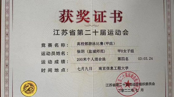 7月9日至11日,江苏省第二十届运动会高校部游泳比赛在南京圆满落下帷幕。公司地科191徐玥同学代表学校在比赛中发挥出色,取得1铜,2个第四名的好成绩。