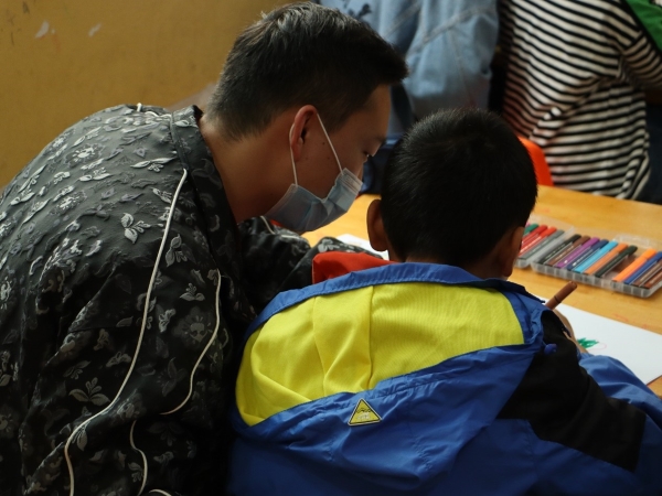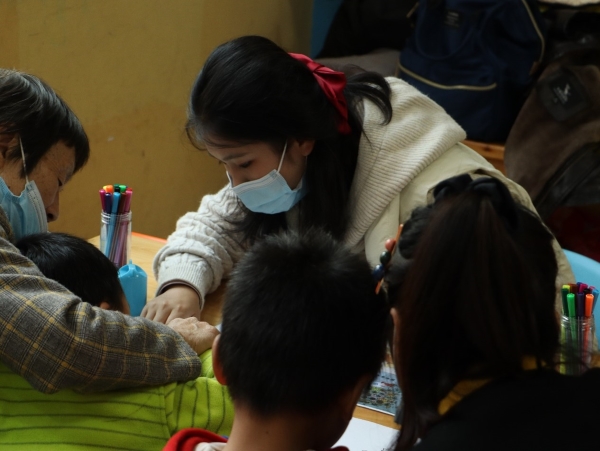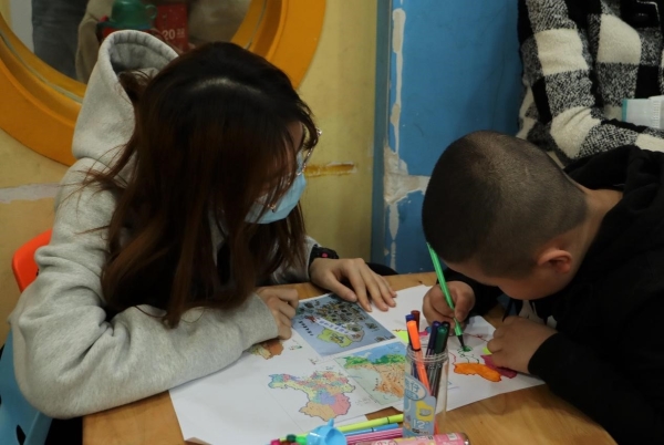 活动开始,老员工志愿者与特殊儿童在心理活动教室里进行热情交流,并为孩子们送上了水彩笔。鼓励他们勇于用画笔表现自己的内心世界。作为地理师范专业的老员工开始教导孩子们进行中国地图的绘制并用水彩笔进行上色。孩子们在志愿者的帮助下,逐渐画出了中国的轮廓,并对祖国的版图有了更进一步的认识。活动结尾,志愿者老员工带着孩子们一同合唱国歌。老员工志愿者带队队长何曜黄说:“此次志愿活动以结合孩子的身心发展规律与所学专业特色为主,表达了我们师范生对孩子们的关怀与爱护,同时表达了老员工志愿者对党和祖国的无限热爱与美好祝福。”活动在孩子们的欢声笑语中落下帷幕。