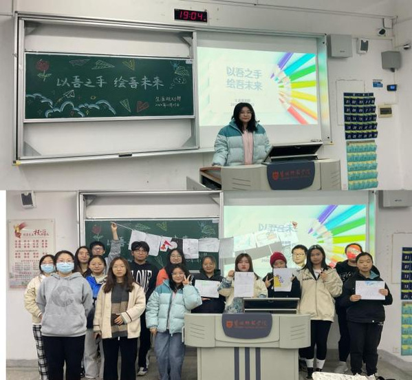 本次活动主要以现场绘画创作的形式展开,言语不能表达出来的,或许绘画可以。通过图画作品,同学们描述了理想中的自己,亦或是理想中的生活方式,而绘画内容也具体到未来某天自己正在做的事情。红橙黄绿青蓝紫,同学们用不同颜色的画笔描绘着属于自己的未来与理想,在画纸上涂绘着各自靓丽的青春色彩。在工作人员的引领下,同学们相互交流各自的创作理念,介绍各自的作品,分享每幅作品以及每个画像所蕴含的意义。地科222班的丁雅欣与同学们分享了她的理想生活——猫狗双全。地科223班的况笑雅通过自己的画作,向同学们介绍了她理想中的职业——一名中学地理老师。多样的配色,不同的画风,这些都是同学们个人特性与个人理想的象征。