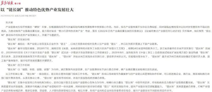 “链长制”是指在一条产业链上培育龙头企业作为“链主”,以地方党委政府相关负责人任产业链“链长”,并以此为抓手贯通上下游产业链条。