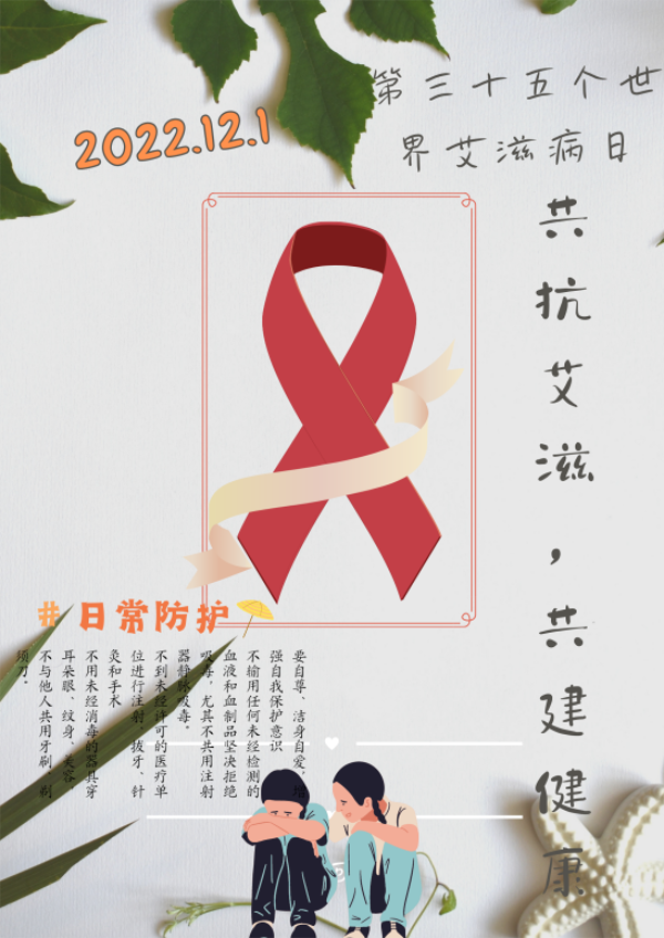 今年12月1日是第35个“世界艾滋病日”,为进一步遏制青年员工人群中艾滋病的传播和流行,促进青年员工身心健康发展,省教育厅办公室下发了关于做好2022年“世界艾滋病日”宣传教育活动的通知。公司爱心服务社积极响应号召,为此举办“青年携手,共抗艾滋”为题的视频、图画征集活动。
