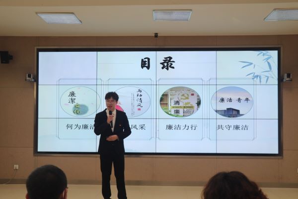 廉洁文化主题团课。公司“水清润心田,风正扬廉帆”主题团课由吴玮一主讲,郁江峰、裴思佳两名同学协同参与。正如团课中所讲,“追求高尚纯粹境界,争做清正廉洁青年,永葆廉洁的青春底色。”他们在备赛期间反复练习,用实际行动展示了青年人在弘扬廉洁文化中应具备的思想站位。