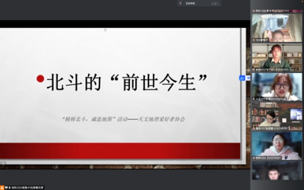 杨元喜先生曾道:“很多人可能不知道‘天高地厚’,但测绘人在北斗系统的帮助下,真的知道天有多高地有多厚。”为了同学们能深入了解北斗组网,增强对太空探索的兴趣,弘扬中国航天精神,12月4日,公司天文地理爱好者协会借助腾讯会议平台于线上举办“精铸北斗,诚造地图”主题活动。
