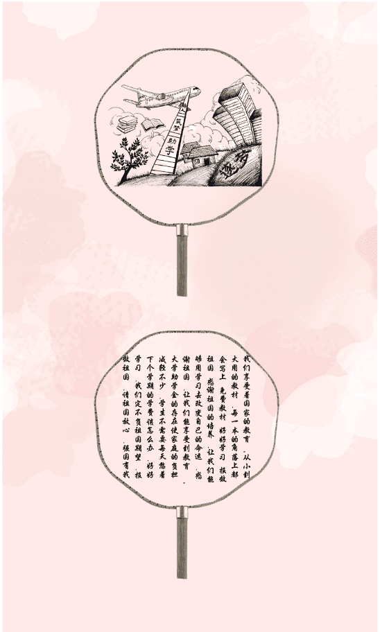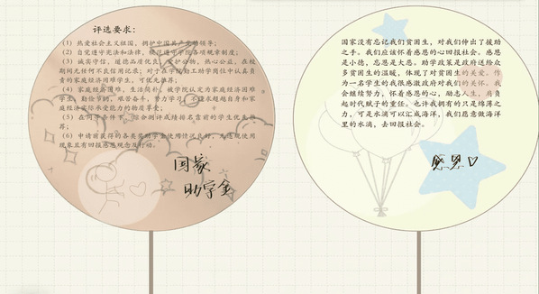 本次活动采用扇面书法绘画的形式在线上征集作品。设计者通过分享自己对学校资助的感恩之情,或是对学校资助的积极看法和意见,以“扇”的形式表达出来。此次活动吸引了同学们的积极参与,地科213班周蕴同学的作品以图文并茂的形式表达出自己对于国家、学校资助政策的感恩之情;地科223班张前程同学的作品中传达出其对于学校资助体系的了解以及其积极进取、不畏困难的精神面貌。