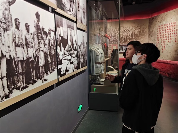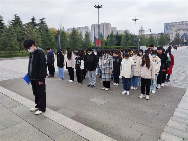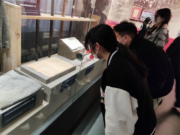 活动中,同学们走进盐城新四军纪念馆,深切缅怀抗日烈士们的丰功伟绩,向烈士致以最崇高的敬意。在纪念碑前,同学们聆听了新四军抗战故事,重温铁军精神,同时也意识到幸福生活的来之不易。一寸山河一寸血,一抔热土一抔魂。新四军纪念馆里展示的文物、图片、书籍等以不同的载体,从不同的角度生动形象地记录和再现了新四军战士艰苦卓绝的抗战历程。缓缓走近其中,听着讲解员的讲解,看着展柜中陈列着的战士们使用过的物品,感受着时间在其上留下的痕迹,同学们的心灵受到极大震撼,思想也得到了升华。