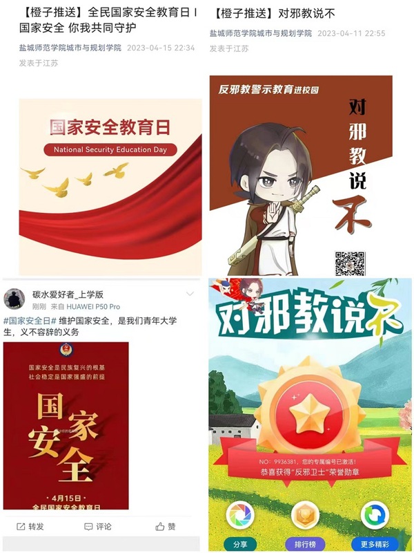 广泛宣传,营造浓厚氛围。公司积极创新传播形式,充分利用公司微信公众号等新媒体,宣传国家安全的知识,同时开展“对邪教说不”网上签名活动,以身作则,践行反邪教斗争;组织员工参加“微博#国家安全日#话题”互动,并发表自己对国家安全的认识,使得员工能够关注国家安全,让国家安全意识深入人心。