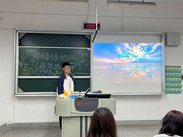 “一座城市的经济实力固然重要,但往往最能打动人心的还是其中蕴含的人文情怀,大到旅游景点,小到一份美食,这其中的细节,更能彰显一座城市的文化底蕴。”活动中,地科223班杨潮通过图文结合的方式,为我们介绍了几座典型城市的风采,其中有热情好客的山东,有山清水秀的大理,还有温柔婉约的苏州。地科213班王邹峰为大家介绍了盐城东台,那里有着被称为“森林氧吧”的黄海森林公园和深含历史文化韵味的西溪古镇和海春轩塔,长期的历史积淀使东台形成了具有浓郁特色的海盐和民俗文化。地科221班周雨佳为大家介绍了“创新之都”深圳,她从深圳的地理位置及改革开放历程入手,让大家深深感受到了一座城崛起背后的艰辛和奋斗,更加了解深圳开放、创新的人文风情。