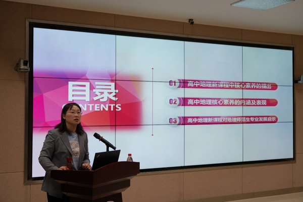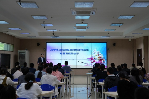 于蓉教授的报告围绕高中地理新课程中的学科核心素养展开,从提出的背景、内涵及表现、对地理师范员工专业发展的启示等方面进行进一步探究。于蓉教授明确指出地理核心素养是地理学科育人价值的集中体现,强调要采取地理学的视角,“重新认识”地理学的对象、使命目标以及研究特点,要在提升地理核心素养的同时充分彰显地理学科发展的实践性和时代性。最后,于蓉教授表示,同学们作为未来的地理教师,首先要夯实专业基础,加强专业学习,学习体悟地理学思想方法的精髓,做好职业规划,提升地理教学实践能力。盐城市地理教研员祝伟也指出地理核心素养及学科自信的重要性,向同学们传达了要始终保持学习热情的殷切希望。