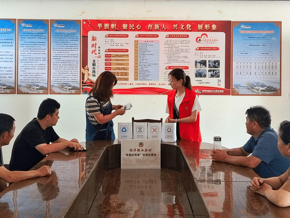 “你们知道吗?回收一个易拉罐,可以节省3小时的电视电力;一颗1号电池烂在泥土里,会使1平方米的土壤永远失去利用价值。”互动中,团队成员用 “可回收物”“厨余垃圾”“有害垃圾”“其他垃圾”等标识卡片,结合生活实际和具体情境,进行垃圾分类引导和示范,积极引导村民从自身做起,养成垃圾分类的好习惯。