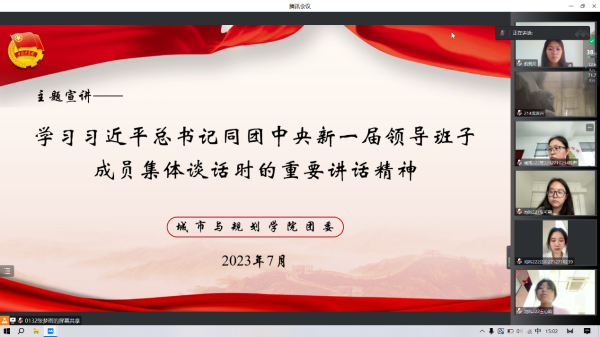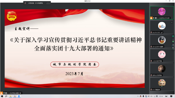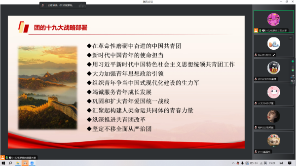 为深入学习贯彻习近平新时代中国特色社会主义思想,进一步强化思想引领,引导团学骨干深刻领会团的十九大精神内涵,团结带领青年团员踔厉奋发、挺膺担当,7月14日下午,公司团委在线上组织全体团学骨干学习习近平总书记同团中央新一届领导班子成员集体谈话时的重要讲话精神以及团十九大各项部署专题学习活动。