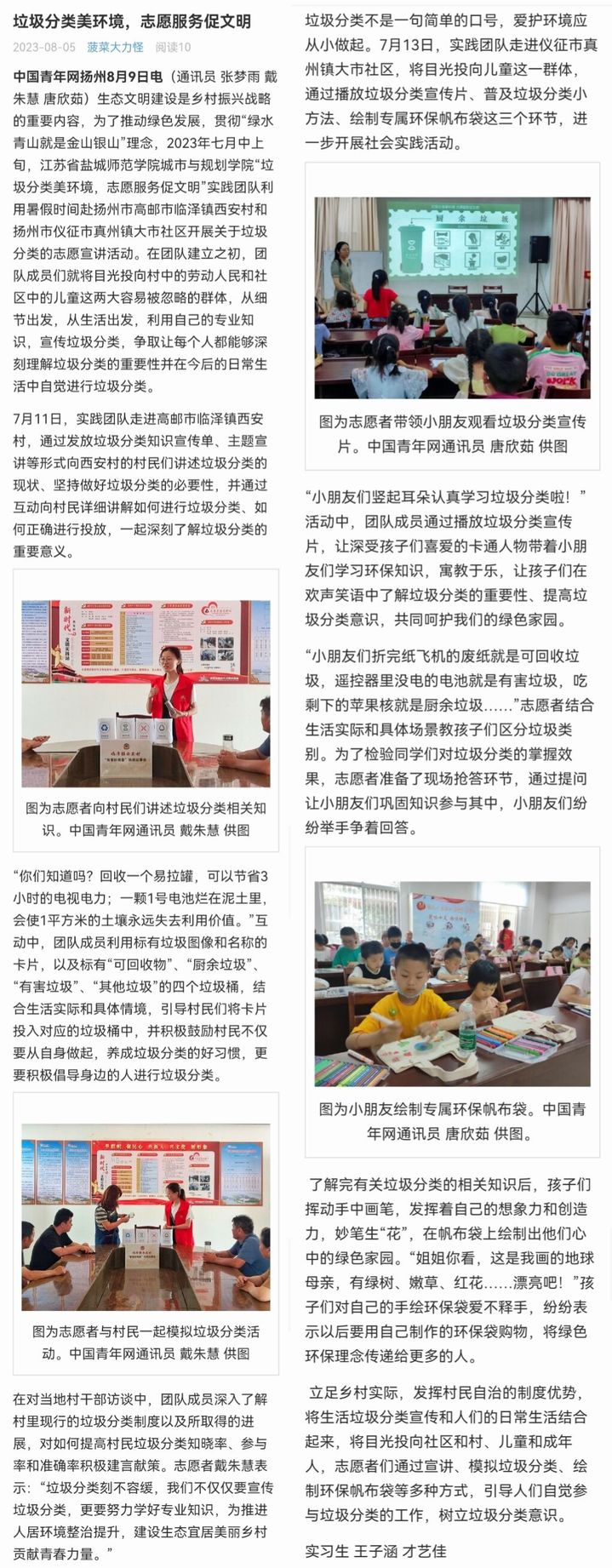 8月9日,中国青年网(中青校园)报道了城市与规划学院“垃圾分类美环境,志愿服务促文明”实践团的暑期社会实践活动。