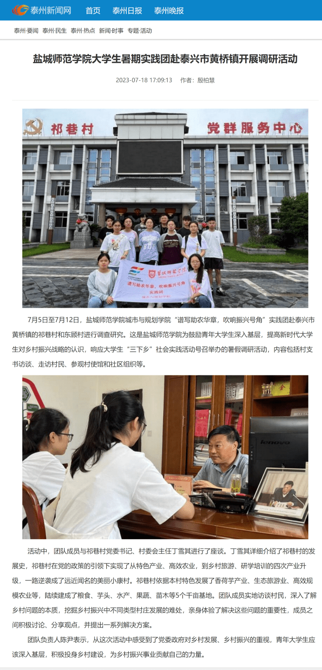 7月18日,泰州新闻网报道了城市与规划学院“谱写助农华章,吹响振兴号角”实践团的暑期社会实践活动。